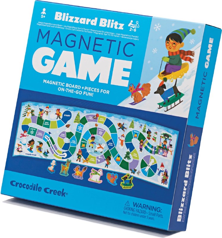 Race across the snow to the hot cocoa stand with this simple magnetic game that's perfect for on-the-go winter entertainment. Players choose a snow day-ready character like a squirrel on skis or polar bear on a sled. Then take turns using the attached spinner and moving to the next shape that matches on the colorful path. Get lucky if you land on a "spin again" or "jump to", but watch out for "lose a turn" spots! The first player to arrive at the hot cocoa stand wins. For 2-6 players.