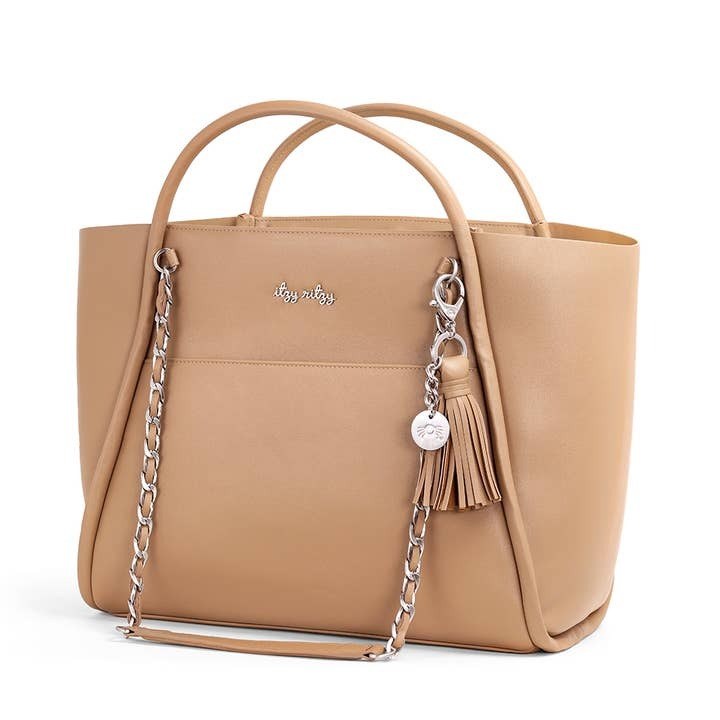 diaper bag for baby to chic purse for brunch! The Boss Tote is designed to move with you featuring an easy-wipe vegan leather exterior and the option to carry by handles or luxe, chain-detailed shoulder straps. Organization is a total breeze with a spacious main compartment offering multiple interior pockets for your valuables, changing essentials & so much more! Plus, a front pocket for easy access & hook closure to keep everything inside secure. Bonus: includes a coordinating changing pad, stroller straps, and removable tassel! Safe to say, you`re going to tote-ally love it!