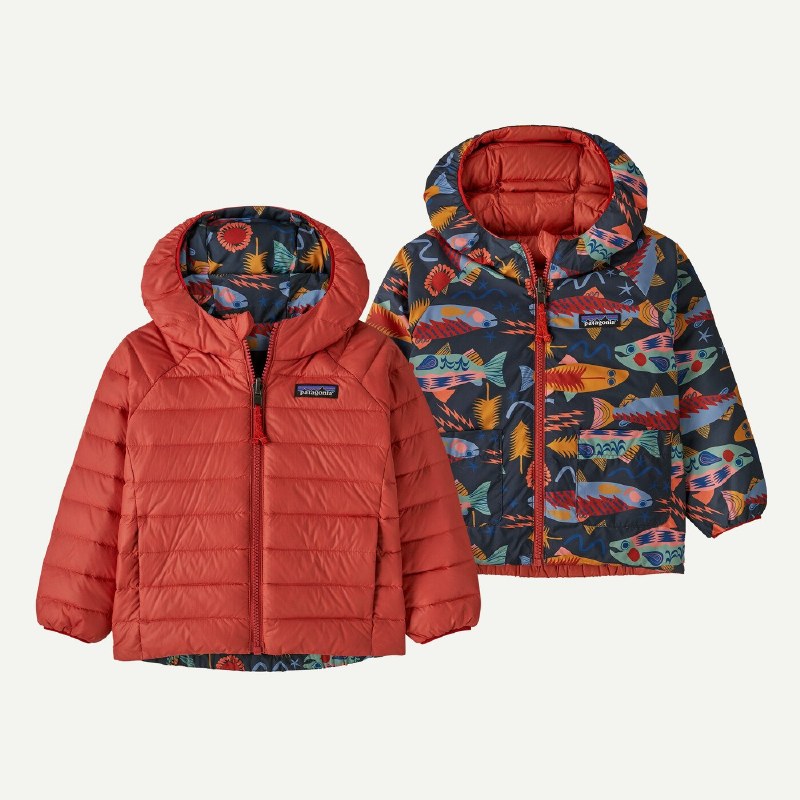 Keep them warm with the Baby Reversible Down Sweater™ Hoody. It has a lightweight, windproof 1.6-oz 30-denier NetPlus® 100% postconsumer recycled nylon ripstop shell made from recycled fishing nets to help reduce ocean plastic pollution; with a durable water repellent (DWR) finish made without intentionally added PFAS. It reverses to a contrasting print made of 100% recycled polyester taffeta fabric. Insulated with 700-fill-power 100% Recycled Down (a blend of duck and goose down and waterfowl feathers reclaimed from down products) for compressible warmth. Made in a Fair Trade Certified™ factory.