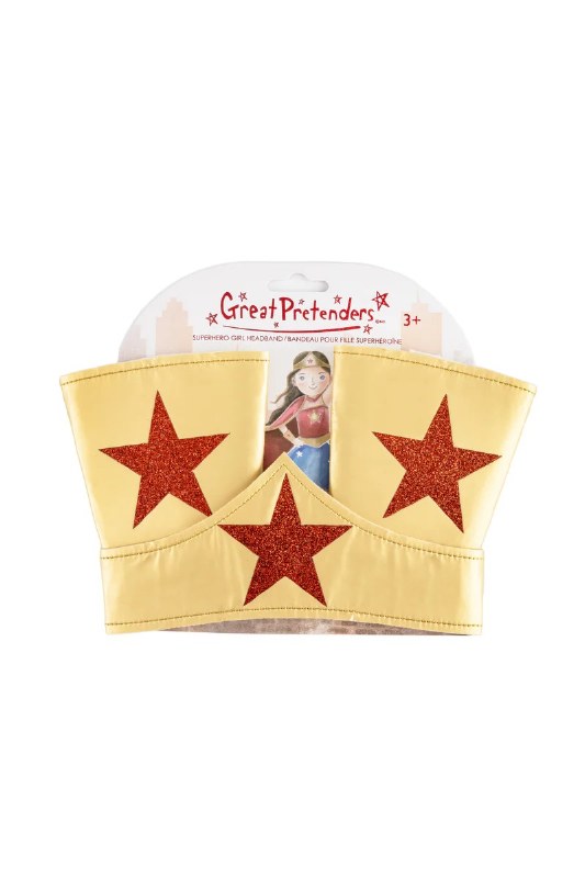 Crafted in gold, each piece is adorned with dazzling red glitter stars at the center, adding a touch of celestial magic to every movement. The headband, with its comfortable fit, stays securely in place as your little Supergirl takes flight on imaginary adventures. The matching wrist bands complete the look, empowering tiny wrists with a stylish burst of superhero flair.